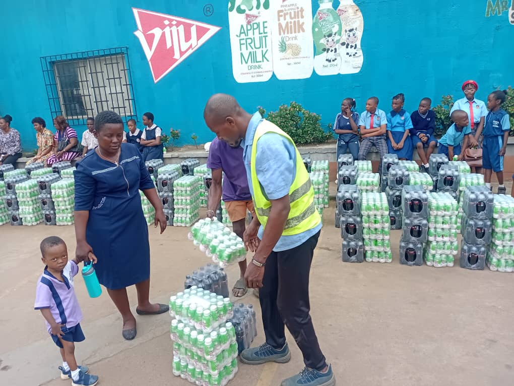 Stacks of beverages were distributed to participating groups in a festive and cheerful atmosphere. Students in uniform, parents with their wards, and representatives from various organizations queued up excitedly as Viju staff coordinated the generous handover of products.